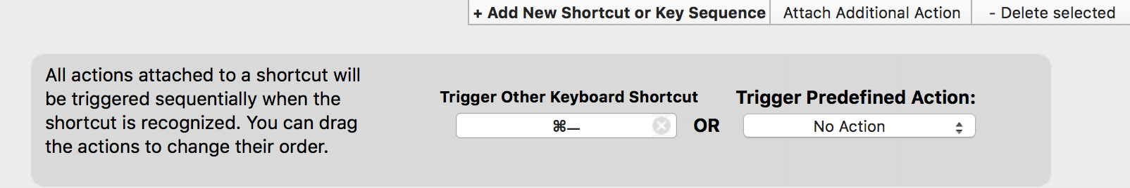 3. 그리고 Trigger Other Keyboard Shortcut에 Option+Command+H를 친 후 우측 상단의 Attach Additional Action 창을 띄운다