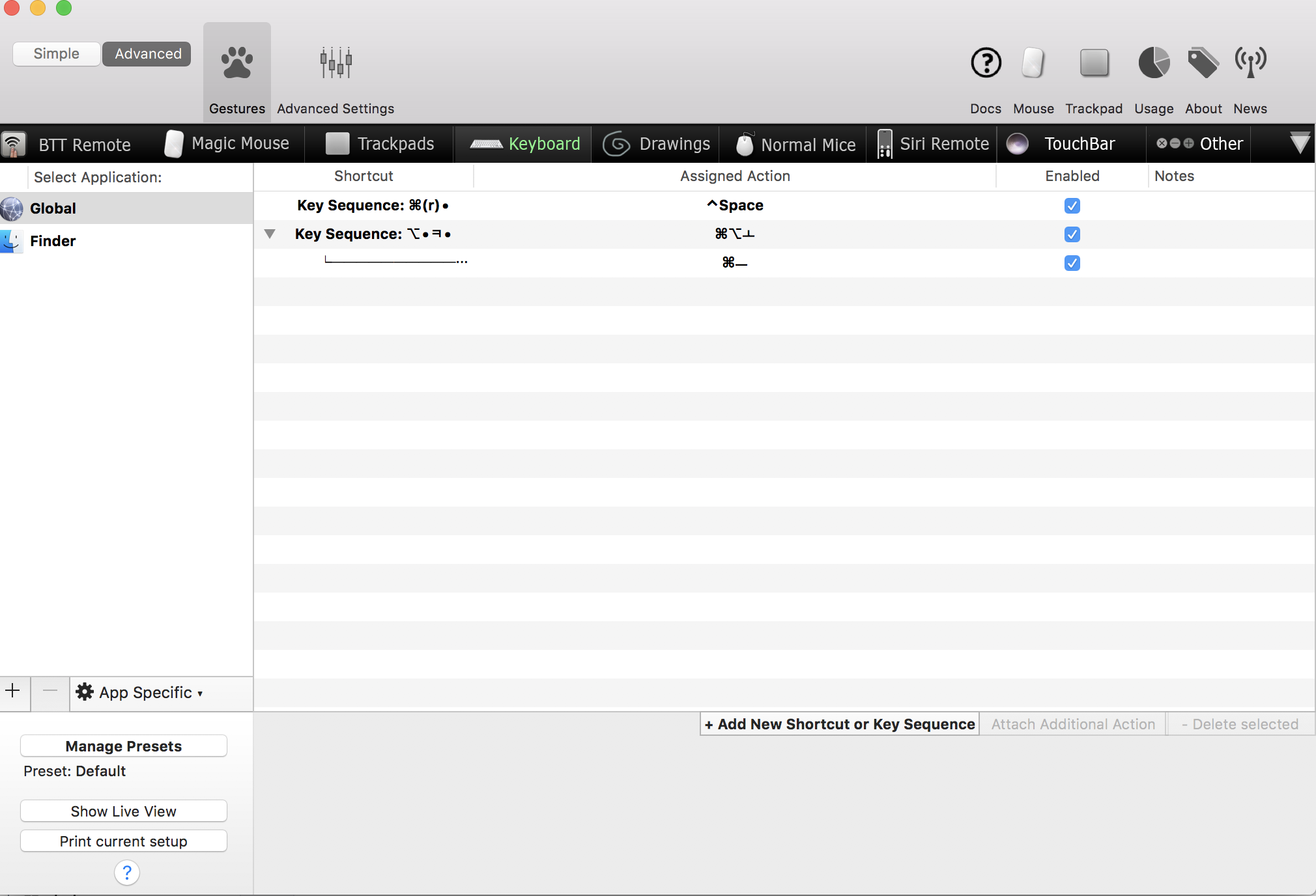 1. BTT Preferences 창의 Keyboard로 들어가 아래 '+Add New Shorcut or Key Sequence'를 누른다