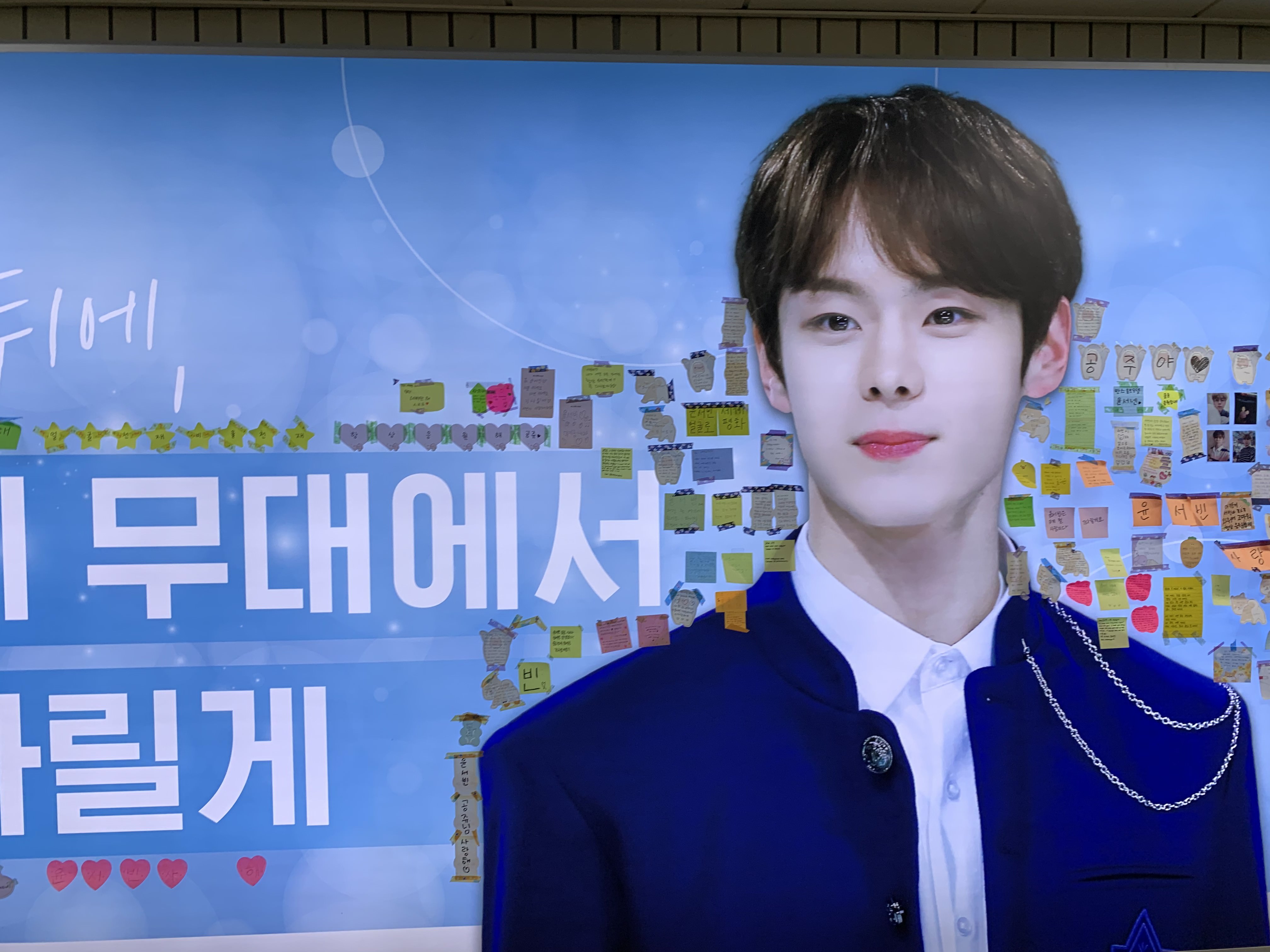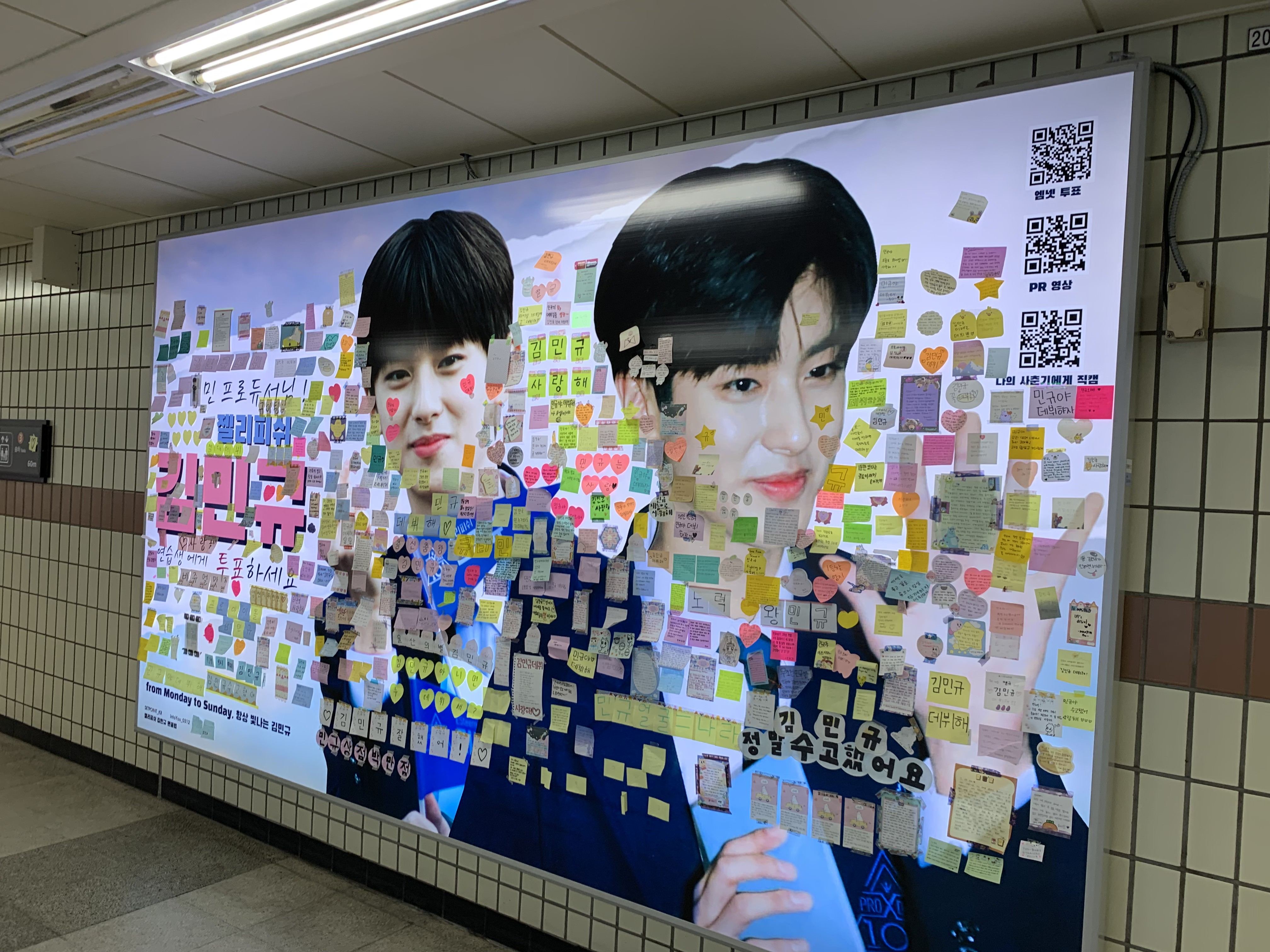 젤리피쉬는 알겠는데 김민규는 누구야? 하는 생각에 검색해보니, 프로듀스101에서 얼굴을 담당했던 친구인데 실력이 떨어져서 아쉽게 고배를 마신 친구였다. 우측 상단 투표 QR코드를 보니 방송 중에 걸린 광고판인 듯하다. 결국 원하던 데뷔는 하지 못했지만, 이 정도 인기로 봐선 꾸준히 관심을 받다가 조만간 데뷔하지 않을까 싶다. 게다가 대형 기획사 소속이니..