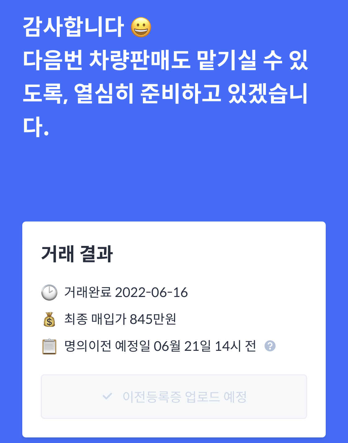 거래가 끝나면 2영업일 내로 이전등록증이 도착하는데, 나는 6시간 만에 도착했다.