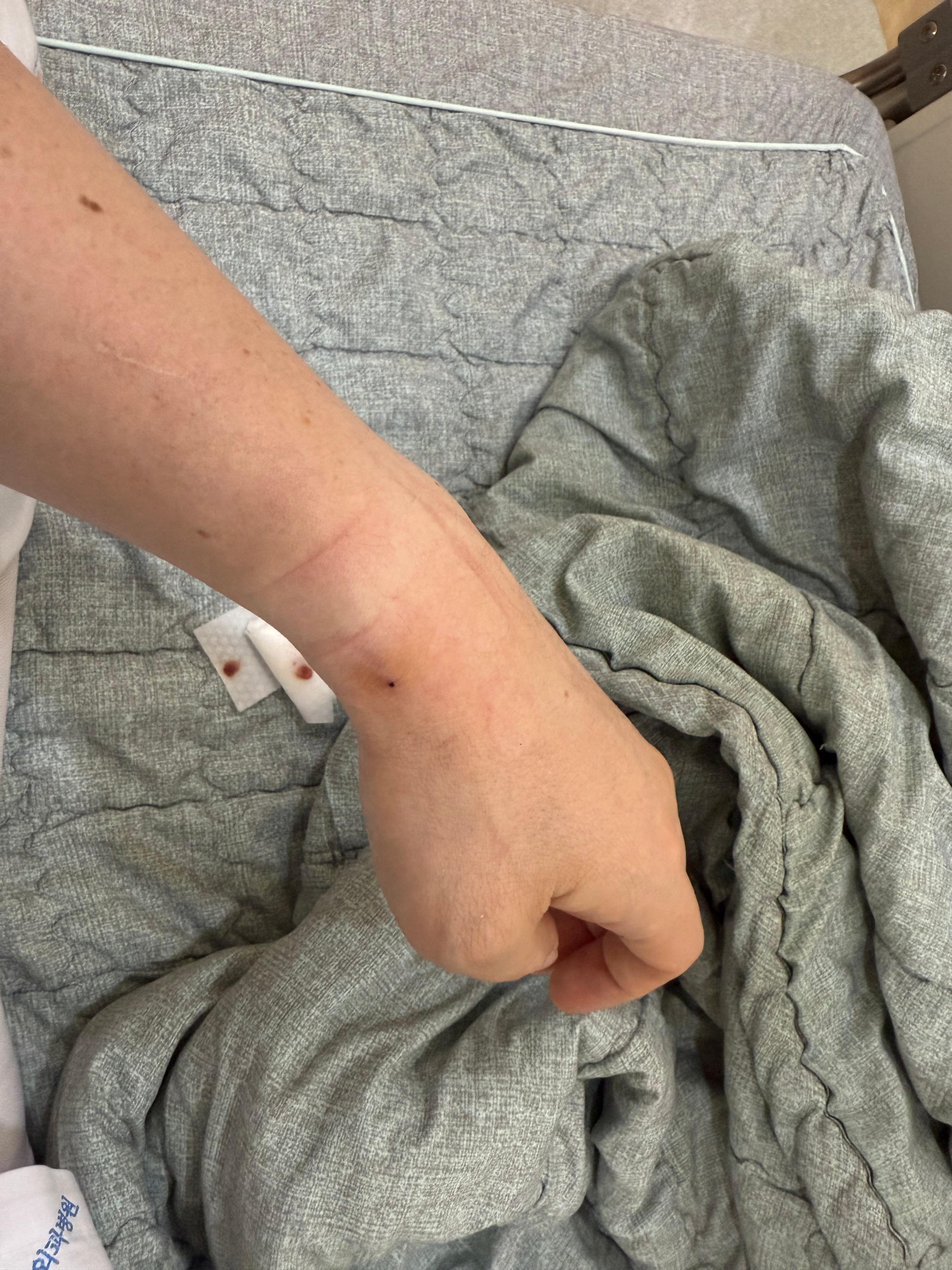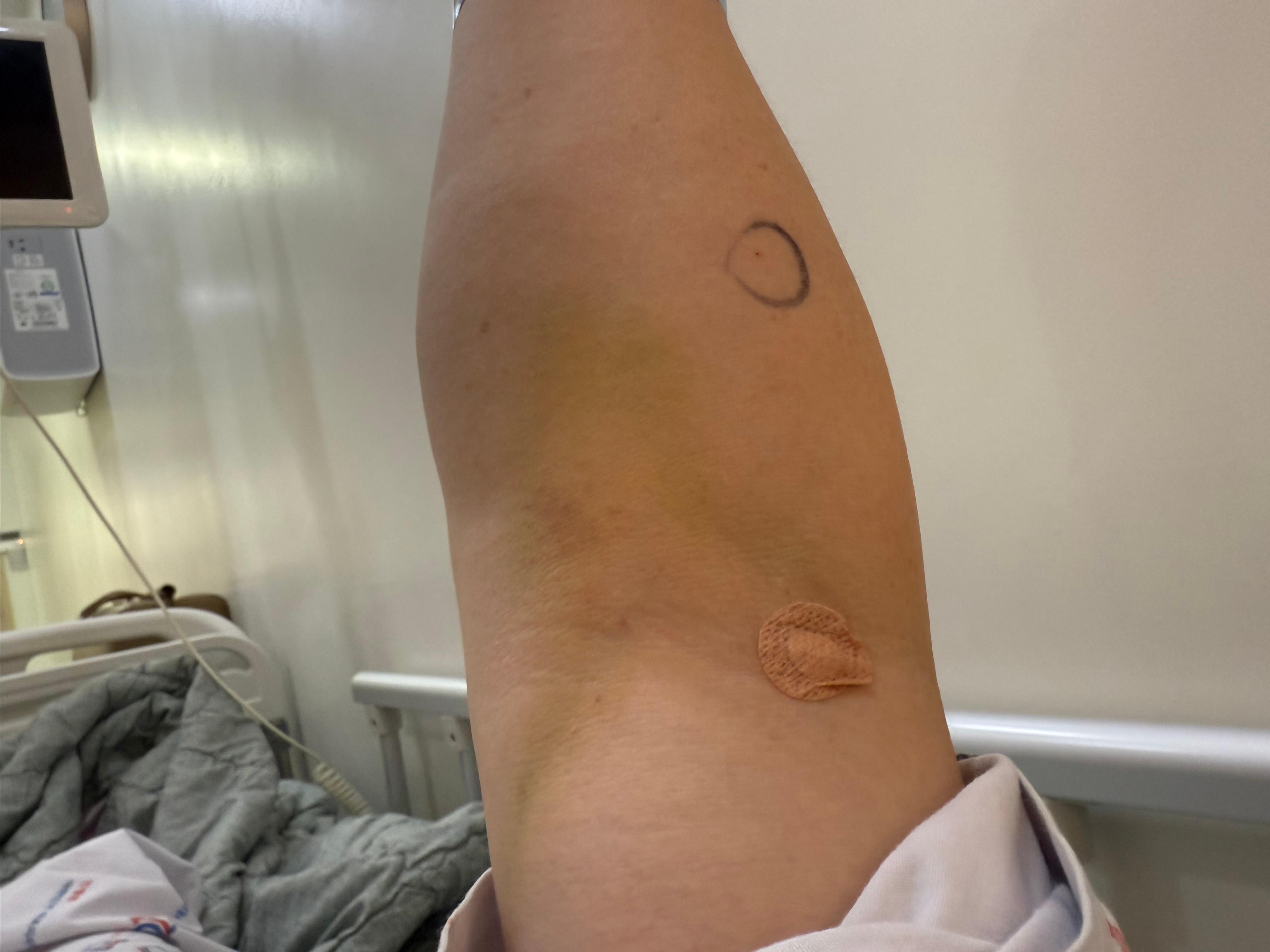 수많은 피검사와 항생제 검사로 인해 멍으로 가득해진 오른팔,