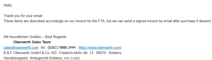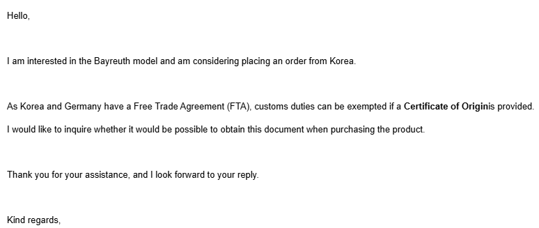 Oberwerth 제품은 독일 제조라 면세가 가능하다. 그래서 FTA 관련 원산지 증명서를 받을 수 있냐고 문의를 했더니,